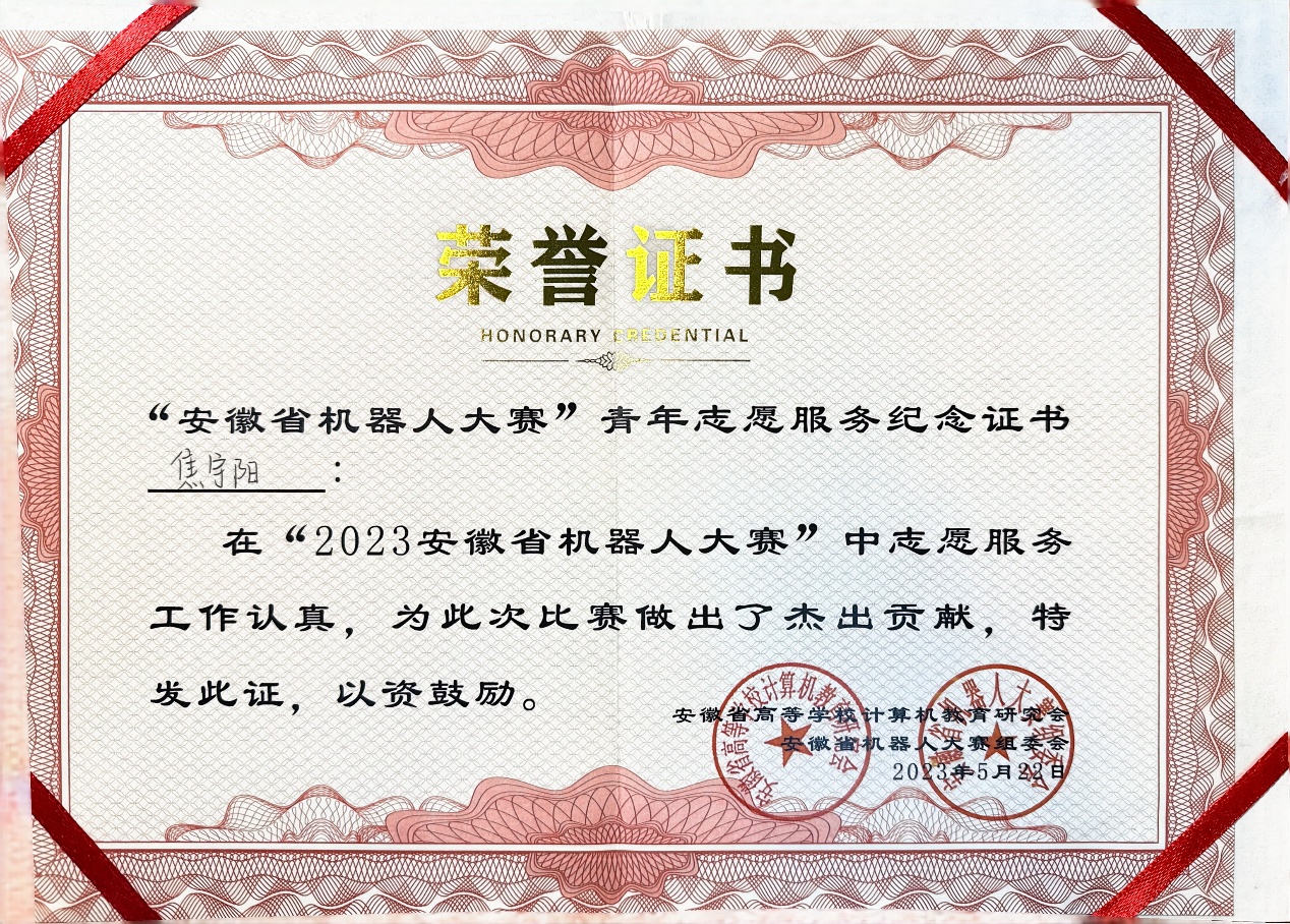 “青春因奉献而闪光,人生因服务而丰盈。”焦宇阳同学始终秉持服务为荣、奉献为乐的信念,热心公益,积极投身志愿活动,用实际行动传递青春正能量。在校期间,他曾担任学院青年志愿者联合会部长,积极组织并参与校园志愿服务、社会公益宣传与社区帮扶活动,累计志愿服务时长超过200小时。他多次参与雷锋月、环保宣传、网络安全宣讲等活动,用专业所学服务社会,以青春热情温暖他人。
