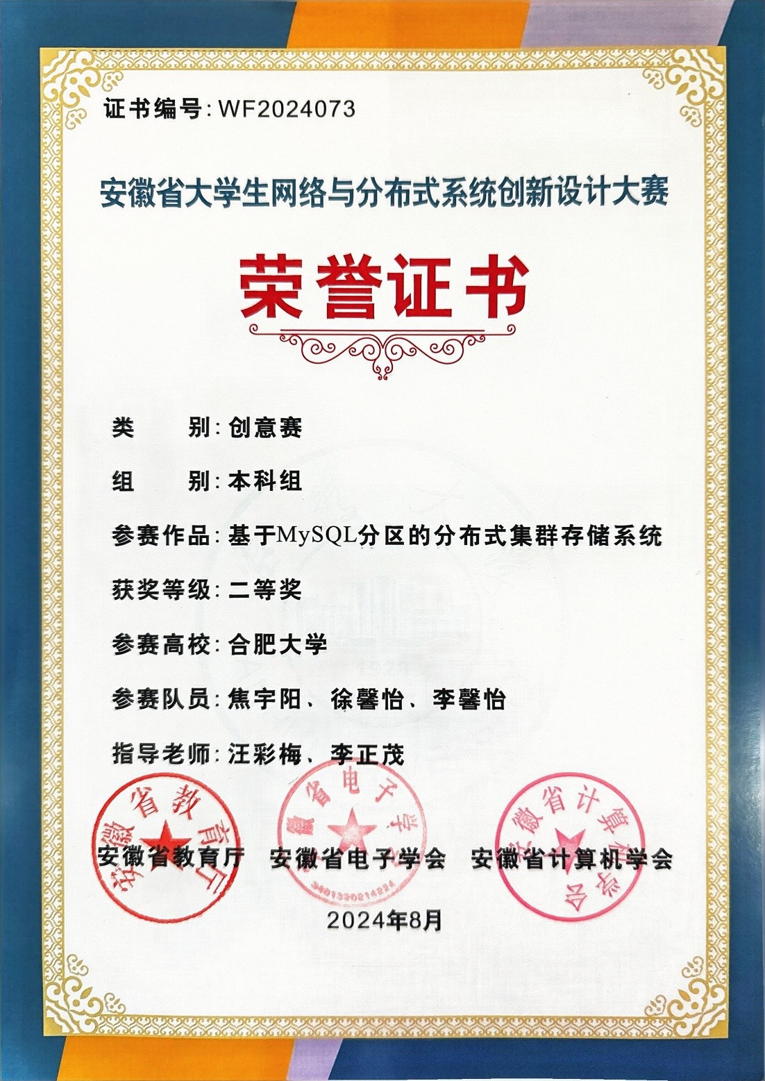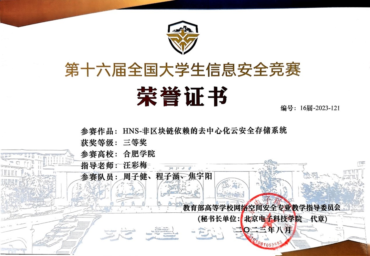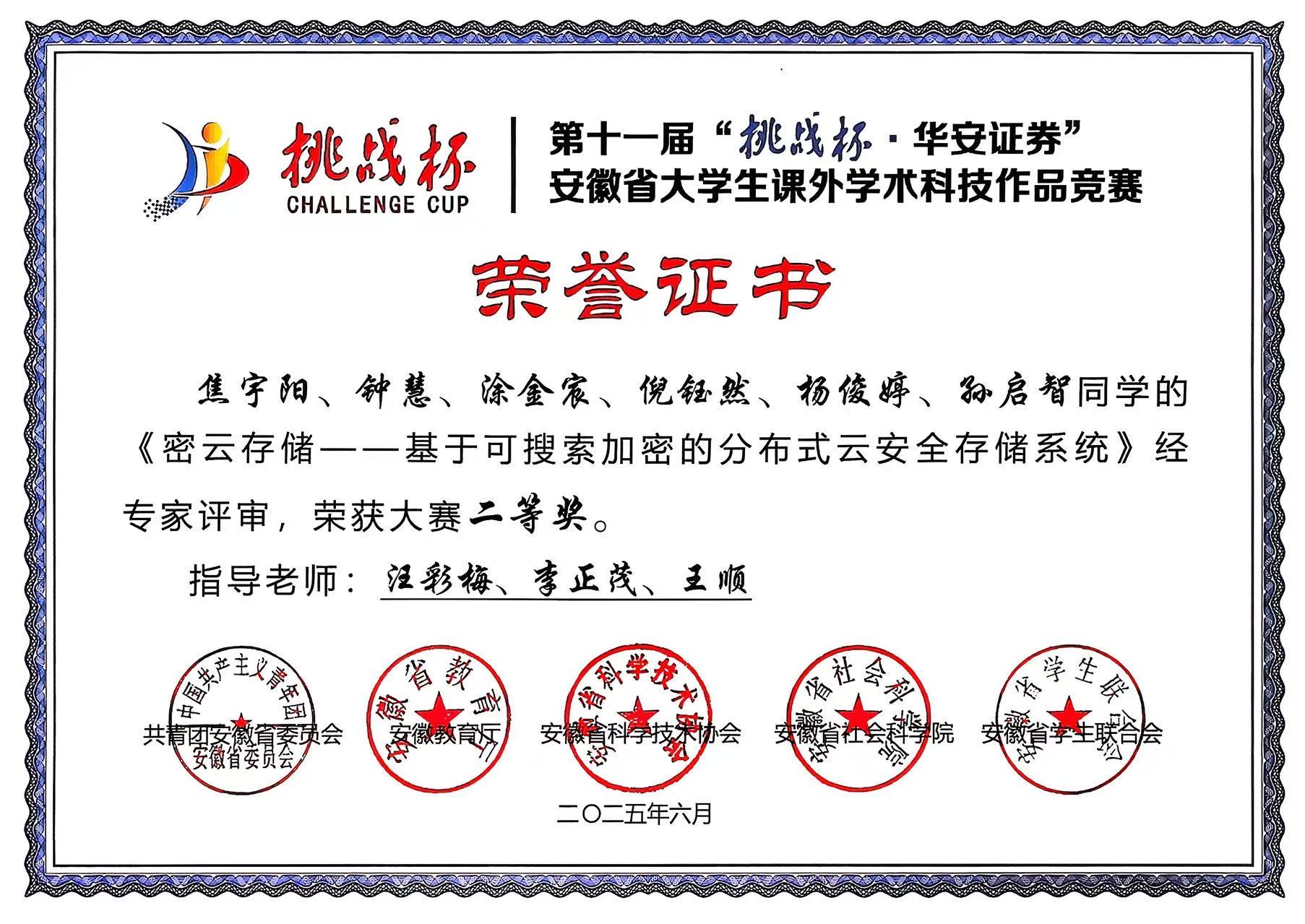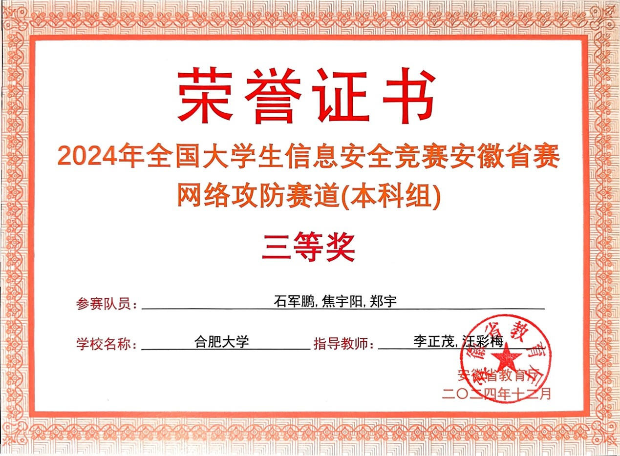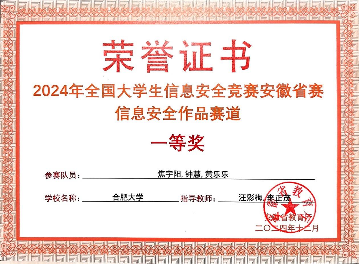 焦宇阳,男,汉族,2004年4月出生,中共预备党员,日韩欧美福利视频_黑人巨大人精品欧美三区_欧美成人另类人妖_欧美在线精品一区二区三区_欧美一区二区三区性视频_日韩精品欧美视频_性欧美极品xxxx欧美一区二区人工智能与大数据学院网络工程专业2022级本科生,担任班级副班长,日韩欧美福利视频_黑人巨大人精品欧美三区_欧美成人另类人妖_欧美在线精品一区二区三区_欧美一区二区三区性视频_日韩精品欧美视频_性欧美极品xxxx欧美一区二区网络与信息安全创新实验室学生负责人。2024-2025年度学业成绩和综合测评成绩双第一,先后多次获得国家奖学金、日韩欧美福利视频_黑人巨大人精品欧美三区_欧美成人另类人妖_欧美在线精品一区二区三区_欧美一区二区三区性视频_日韩精品欧美视频_性欧美极品xxxx欧美一区二区特等奖学金、优秀团干、三好学生等荣誉。在学科竞赛方面,曾获2024年全国大学生信息安全竞赛安徽省一等奖、第十届“挑战杯·华安证券”安徽省大学生课外学术科技作品竞赛一等奖、2024年安徽省大学生网络与分布式系统创新设计大赛二等奖、第十六届全国大学生信息安全竞赛全国三等奖等10余项省级及以上奖项。他专注学科前沿,围绕信息安全技术开展研究,已在投学术论文1篇;授权计算机软件著作权1项(唯一著作权人),在审1项;申请发明专利3项(1项授权,2项实审);主持和参与安徽省大学生创新创业训练项目2项;作为负责人带领团队研发的科技作品已在国家发改委批准建设单位使用测试,技术应用价值得到验证,并获得多位高校专家推荐。学习之余,他曾担任学院青志联部长,积极参加志愿活动,多次受到通报表扬,累计志愿服务时长超200小时。