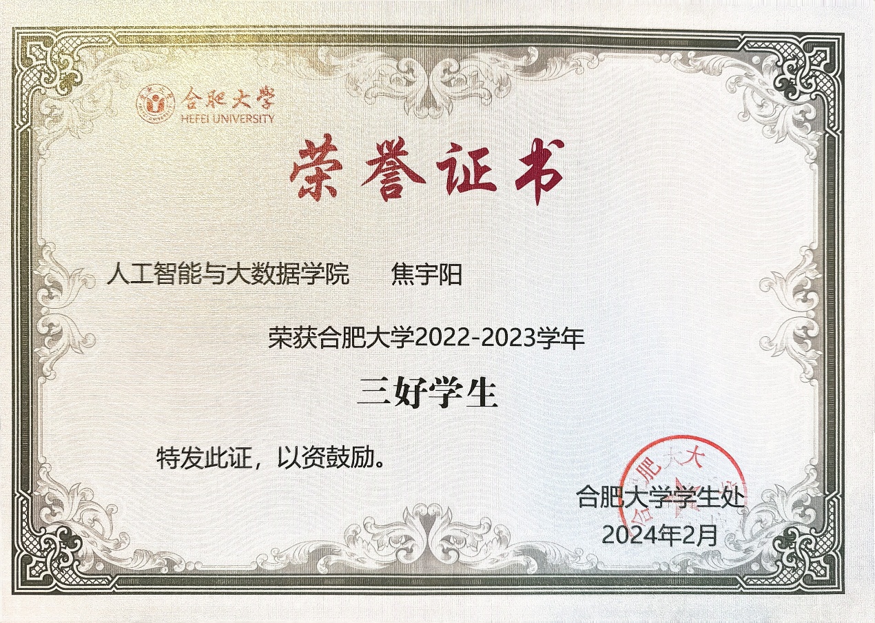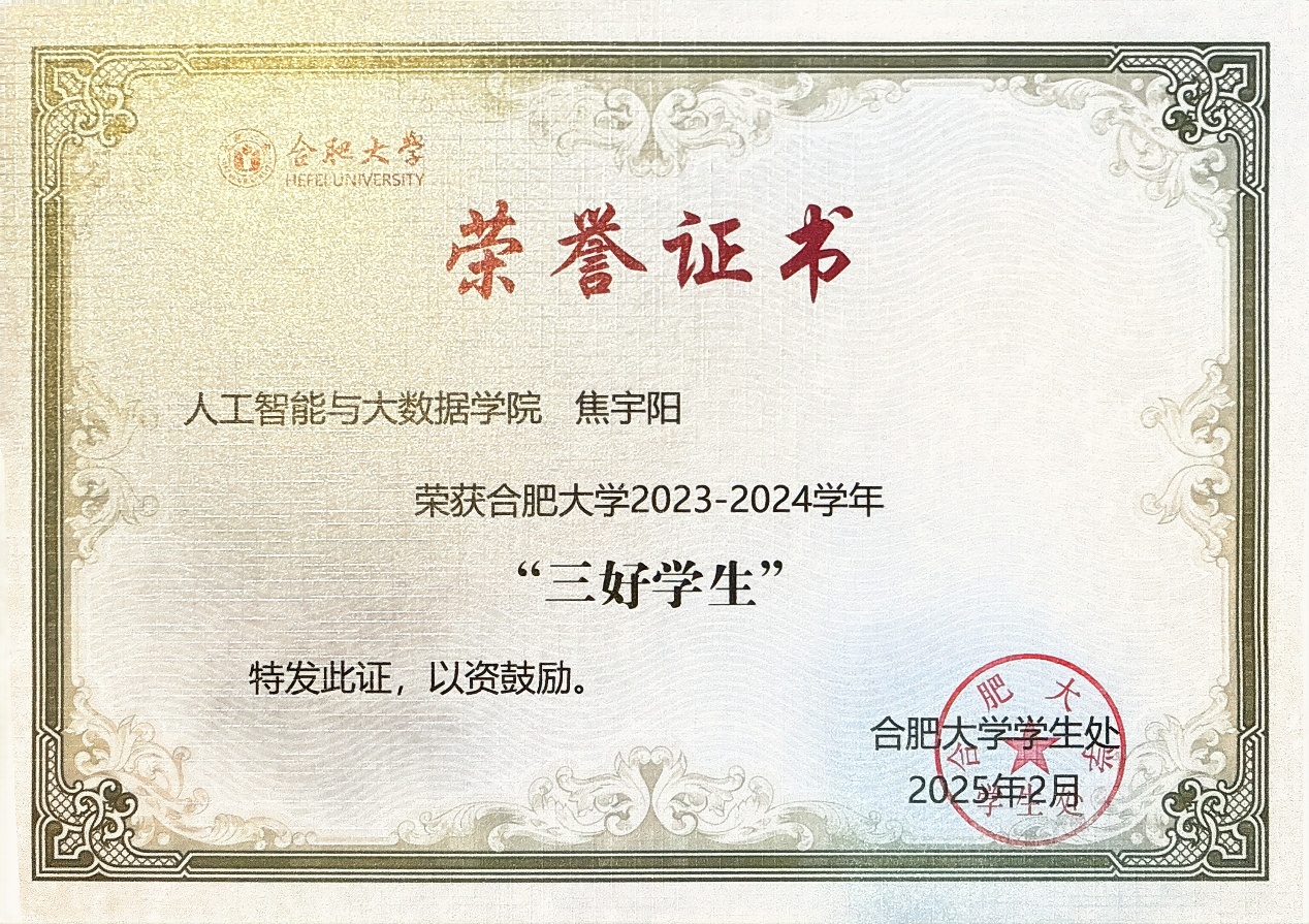 焦宇阳同学以青春之志追逐梦想,以奋斗之姿书写荣光,在学习与实践中不断进步,让青春在拼搏中绽放最耀眼的光芒。他以实干书写青春篇章,用奋斗诠释使命担当,在平凡中创造不凡,在探索中追求卓越。展望未来,他将继续秉承“厚德、博学、善思、致用”的校训精神,心怀理想,笃行不怠,在时代的浪潮中砥砺前行,不负青春,不负韶华。