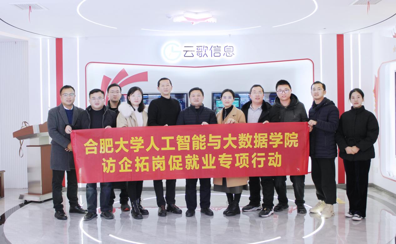 为更好地了解企业需求,拓展学生就业渠道,2024年1月17日上午,人工智能与大数据学院积极开展访企拓岗促就业专项行动,走访合肥云歌信息科技有限公司,此次走访由院长余海峰带队,院党委副书记姚蓓蓓、副院长陈圣兵参加,合肥云歌信息科技有限公司总经理顾云接待。