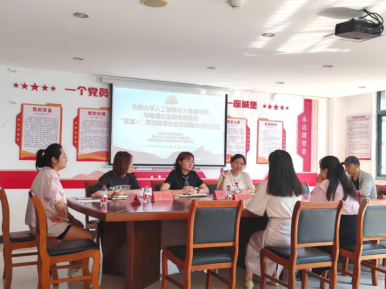 仪式上,临湖社区始信居民区领导致欢迎辞,并介绍社区志愿服务的开展情况,姚蓓蓓书记详细介绍了人工智能与大数据学院的发展状况和教育理念。同时,双方进行了深入的座谈交流。社区领导和学院代表就如何进一步加强合作、推动劳动教育和社会实践活动的深入开展交换了意见。双方一致认为,通过校企合作、校地合作,可以有效地促进学生的全面发展,同时也为社区的发展注入新的活力。