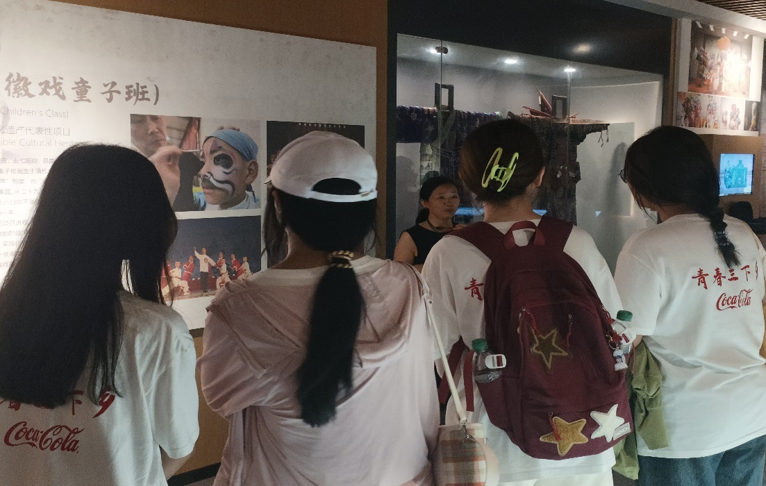 当天下午,志愿者们先徒步抵达了绩溪数字文化非遗展示中心,开始了他们的文化探索之旅。首先,通过展厅内电子大屏幕的介绍,志愿者们初步解了绩溪非遗项目的信息,包括徽墨制作、手龙舞、千秋抬阁、徽剧等。随后,讲解员为志愿者们详细介绍了馆内不同非遗项目的历史背景、艺术特色和传承现状。志愿者们聚精会神地聆听,对绩溪县的民俗风情、传统技艺有了更加全面的认识。