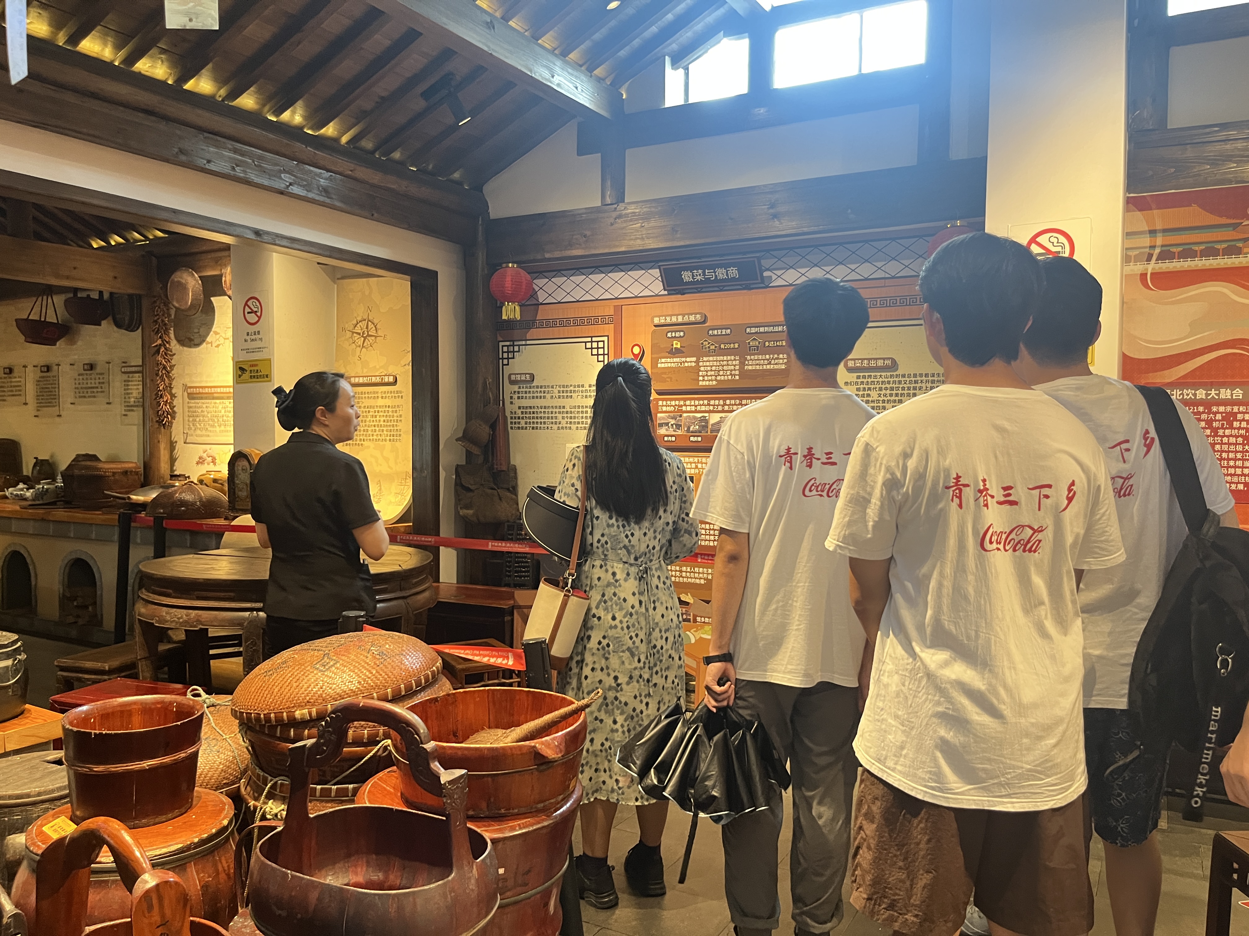 绩溪是徽菜的发源地,“中国徽菜(徽厨)博物馆”的诞生源于对徽菜文化和徽厨历史的尊崇与执着。博物馆内陈列着丰富的徽州美食、传统厨具以及各种与徽菜相关的历史文献,通过菜品模型、情景再现、数字媒体的传统与现代相结合的手法来追溯徽菜数千年的发展史。在专业讲解员的带领下,志愿者们逐一参观了博物馆的各个展区。他们详细了解了徽菜的历史渊源、发展历程以及独特的烹饪技艺,对徽菜文化的深厚底蕴有了更加深刻的认识。