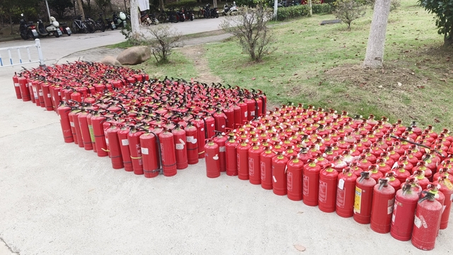 为我处根据年度计划安排,将上半年统计的即将更新、维修、报废的829具灭火器做为新生灭火演练的器材保障,以便充分发挥即将更新、维修、报废灭火器的效能;在新生军训伊始,我处组织物业人员将这些灭火器集中起来,运至实喷演练点附近,并做好发放和回收工作。