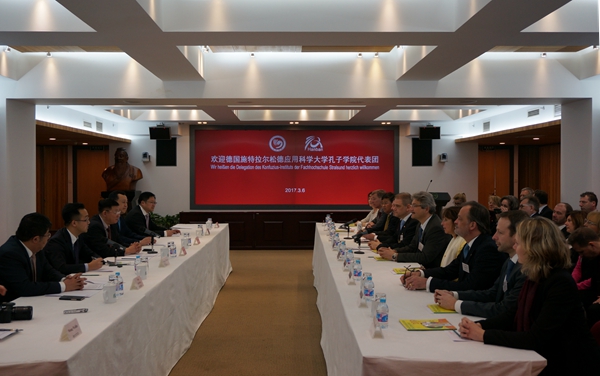 基于合肥学院与德国施特拉尔松德应用科学大学的友好合作关系,施特拉尔松德市市长亚历山大·巴德洛夫曾于2014年及2015年率团两次来华访问。2016年,德国总理默克尔出席了我校在该市共建的施特拉尔松德孔子学院揭牌仪式,为西方在任领导人首次出席孔子学院揭牌仪式。国家汉办主任、国务院参事许琳女士与中国驻德国大使史明德于仪式现场共同邀请巴德洛夫市长再次率团访华,重点就该市对华经贸合作等事宜进行考察。此次,应国家汉办/孔子学院总部邀请,由我校施特拉尔松德孔子学院组织,巴德洛夫市长率团于2017年3月5日抵达北京,并于3月6日到访国家汉办/孔子学院总部。国家汉办副主任、孔子学院总部副总干事马箭飞,欧洲孔子学院处处长杨金成等,亲切会见了代表团一行。校党委书记蔡敬民参加了会见。