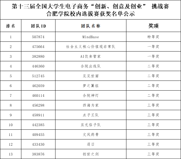 第十三届全国大学生电子商务“创新、创意及创业” 挑战赛合肥学院校内选拔赛,经过激烈的角逐,现将获奖名单公示如下: