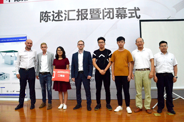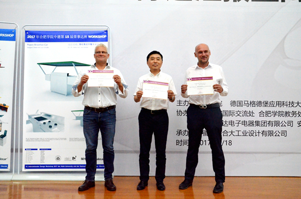 在项目陈述汇报会上,各设计组分别上台介绍了自己设计制作的相关产品,并由奥拉夫教授点评了设计方案。新颖的设计方案,贴近大众的设计理念,赢得现场一致好评。大会还为参赛学生们颁发了优秀奖以及一、二、三等奖。 本届WORKSHOP通过包括德国马格德堡应用科技大学、俄罗斯下诺夫哥罗德建筑大学以及中国合肥学院在内的3所高校、10个小组、48名师生的精诚协作,圆满完成了预期目标,在锻炼了同学们实践能力的同时,也得到了学校、企业的高度认可。