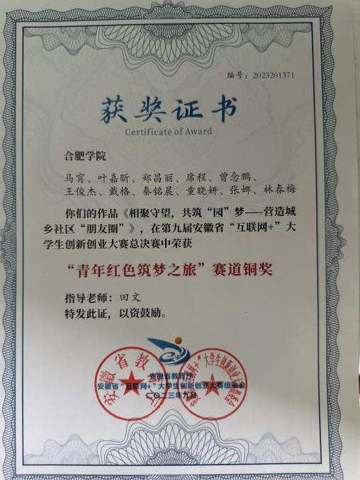 其中参加的大学生创新创业大赛的相聚守望,共筑“园”梦——营造城乡社区“朋友圈”的项目进入省赛。本项目是合肥首个社区高校联动公众参与的微改造更新团体,项目目前采用高校老师带动高校学生、高校老师连线社区/乡村负责人、社区/乡村负责人带动社区/乡村居民三方共同参与的项目,U-P-V组织构架高校(师生)-乡镇/社区)-居民三方联动。一定程度上解决了西园新村老旧社区和乡村微景观更新的问题。我们以“以点带线以线带面”为宗旨,采取三个统一:统一根据社区/乡村当地文化和时代背景为社区/乡村提供多种景观微改造方案,统一提供技术指导、统一帮助社区/乡村改造,带动本地微景观改造和发展,统一规划社区和乡村环境,助力实现乡村振兴。通过当地社区/乡村负责团队和当地居民意见指导规划设计修改,现在拥有社区团队和专业设计团队,已取得20处微景观改造。项目获安徽省2023年中国大学生计算机设计大赛安徽省赛三等奖、乡村振兴创新创业大赛二等奖等本项目相关证书及媒体报道。2023年项目总额实现8500元。
