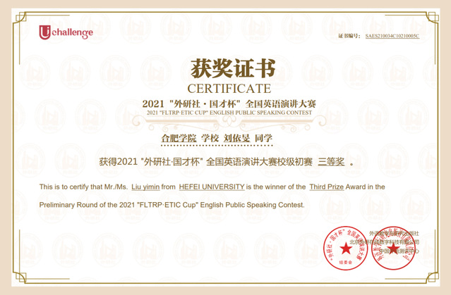 外研社国才杯全国大学生英语演讲大赛校级一等奖;