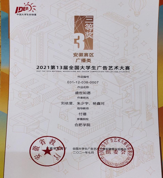 全国大学生广告艺术大赛省级三等奖;