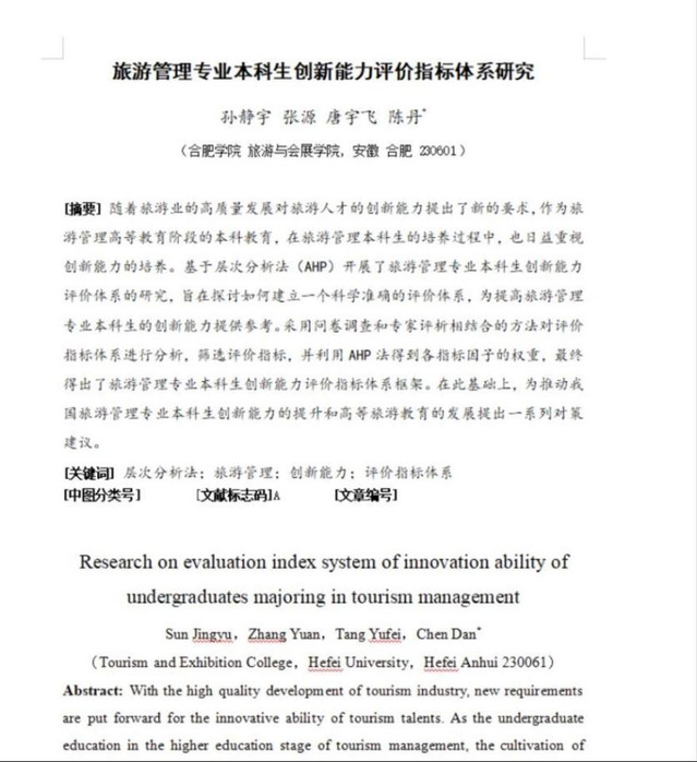 2023-2024学年中,本人注重创新能力的落地和精进。在导师的带领下,在《西部旅游》期刊中发表论文一篇,标题为《旅游管理专业本科生创新能力评价指标体系研究》。该论文在基于层次分析法(AHP)开展了旅游管理专业本科生创新能力评价体系的研究,旨在探讨如何建立一个科学准确的评价体系,为提高旅游管理专业本科生的创新能力提供参考。文章采用问卷调查和数据分析相结合的方法对样本数据进行统计分析,得出了旅游管理专业本科生创新能力评价指标体系框架,并结合实际案例进行了验证。