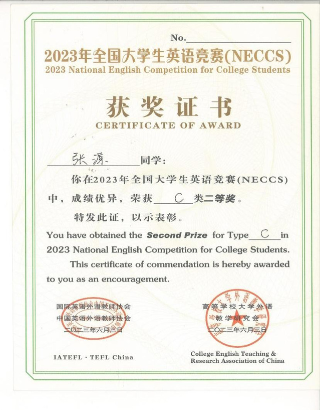 同年末,本人还组建团队参加2023首届全国旅游产品策划大赛,获得全国优秀作品奖。在其他比赛中,本人还赴蚌埠参加2023年安徽省“外研社杯”全国英语演讲大赛决赛,获得特等奖。