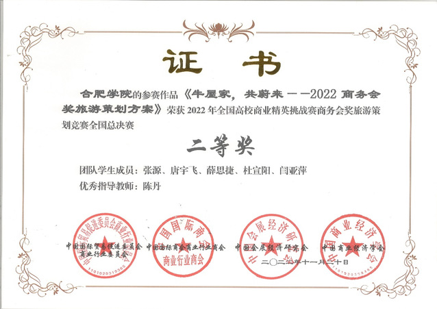 2022-2023学年中,本人积极学习创新创业知识,并在该学年踊跃参加各项比赛。其中,在全国高校商业精英挑战赛商务会奖旅游策划竞赛中获全国总决赛二等奖。比赛期间,团队就黄山国际会展活动做出推介方案,方案中对黄山进行了调研,深入了解到黄山如今正推进建设生态型国际化世界级休闲度假旅游目的地城市,在践行‘两山’理念的生态平衡发展路径下,致力于营造既与国际接轨、又具有本土特色的城市环境。