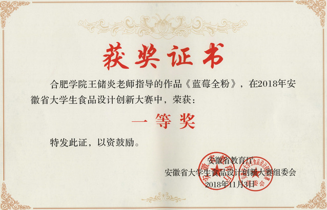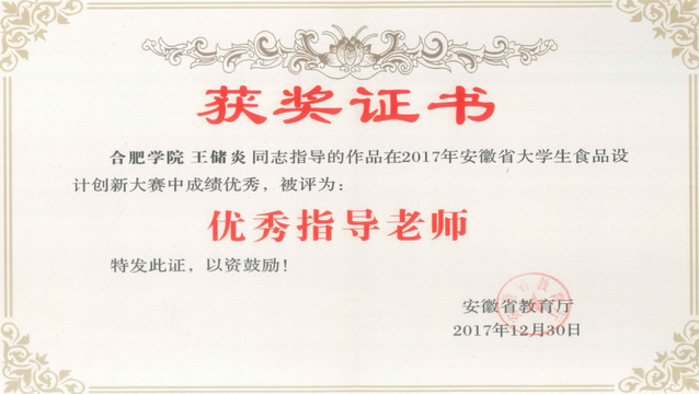 (王储炎老师在实验室) 王储炎老师多年来一直从事农产品加工、功能性食品开发和农业资源综合利用方面研究工作,先后主持和参与国家科技支撑计划项目、国家自然科学基金项目、国家星火计划、省重大科技专项、省重点研究与开发计划项目、省自然科学基金项目等50余项,获得全国农牧渔业丰收奖一等奖1项、省科技进步三等奖3项,2021年主持申报的“江淮流域蓝莓新品种选育与精深加工关键技术研究及应用”获得安徽省科技进步三等奖。目前在国内外刊物上以第一作者或通讯作者发表论文40余篇,授权国家专利10余项,制定安徽省地方标准2项,主编教材《果汁果酒加工实训》,参编著作3本。 在教研上,他多次主持省级教学研究重点项目、省级校企合作实践教育基地项目等,均以“优秀”成绩结题验收。2015年获得安徽省教学成果二等奖,2018年获得校级教学成果一等奖。同时,多次指导学生参加安徽省大学生食品设计创新大赛,获得一等奖4次、二等奖1次、三等奖3次,2017年、2018年、2020年、2022年被评为优秀指导教师。 王储炎老师带领学生获得许多学科竞赛或创业方面的成绩,食品团队积极组织学生参加省级以上各类食品创新大赛,近七年来获得50余项省级奖项。