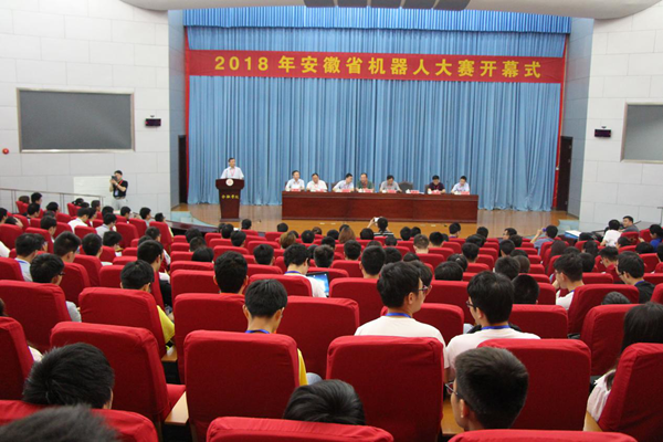 2018年安徽省机器人大赛于6月1日至3日在合肥学院举办。该项赛事由安徽省教育厅主办,合肥学院、合肥工业大学联合承办。该项赛事吸引了安徽省内38所本、专科高校的288支队伍参加,参赛选手近900名。赛事规模浩大,盛况空前。 6月2日上午9点开幕式在合肥学院报告厅A厅举行,安徽省高等学校计算机教育研究会理事长、合肥工业大学胡学钢教授,合肥工业大学教务部副部长、创新创业教育中心主任黄景荣教授,合肥学院教务处副处长储忠教授,合肥学院大学生创新创业中心刘沛平主任,组委会副秘书长、合肥工业大学创新创业教育中心吴文涛副主任,安徽省机器人竞赛技术委员会主任、合肥工业大学方宝富副教授,合肥凌翔信息科技有限公司总经理刘志国等出席开幕式,合肥学院计算机科学与技术系主任檀明教授主持开幕式。