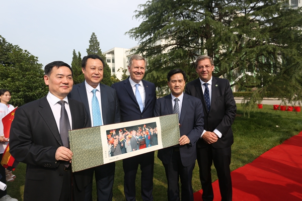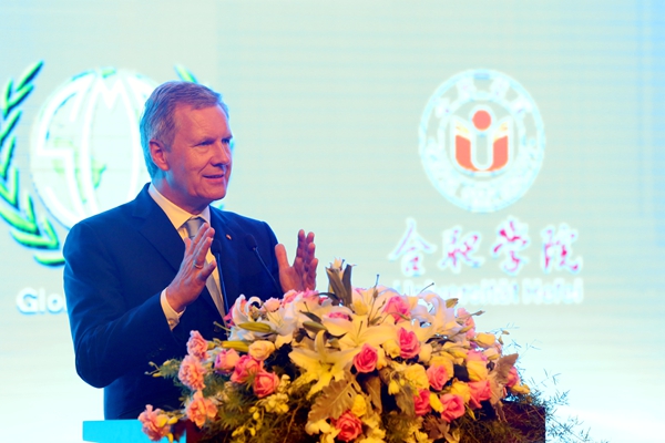 武尔夫主席在合肥学院发表主旨演讲。他深情回忆起第一次访华在学院时种下友谊树、2008年再次访华为友谊树浇水的情景,这也是他种下的第一颗友谊树。他回忆,第一次访问学校时,年轻人态度特别的积极,特别的热情,中国的青年想创造未来,对未来有非常多的期待,给他留下了非常深刻的印象。他在演讲中回顾了德国下萨克森州和安徽的合作历史,双方在农业、食品加工、机械制造和工业设计等领域开展的全方位合作,为中德交流打下坚实的基础。他引用李克强总理的比喻说,中德合作要像吃螃蟹那样,用智慧、技术和耐心把“螃蟹”吃干净,不能吃一口就算了。因此,德国和中国的交流还有很多领域可以携手,可以互相借鉴的地方非常之多,双方可以在新的丝绸之路上加强交流与合作,开创辉煌的未来。