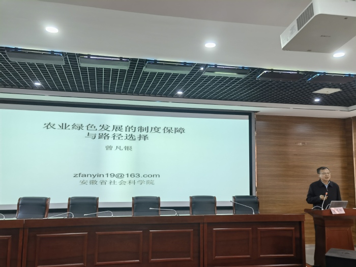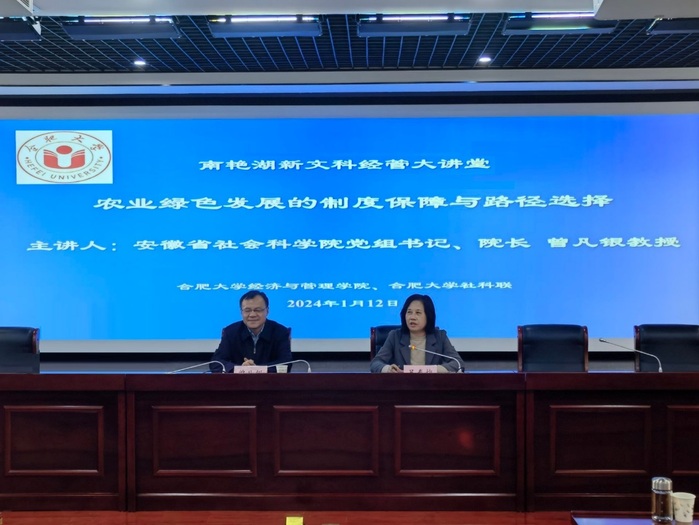 1月12号下午,经济与管理学院、校社科联在6号楼学术报告厅共同主办2024年第一期“南艳湖新文科经管大讲堂”。特邀安徽省社会科学院党组书记、院长曾凡银教授作题为“农业绿色发展的制度保障与路径选择”的学术报告。校长吴春梅教授出席并主持,我校师生100余人到场聆听学习。