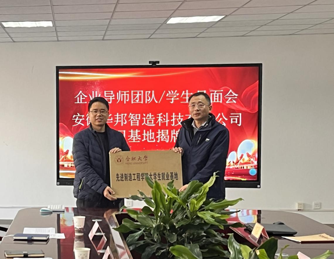 贾代发介绍了安徽华邦智造科技有限公司发展概况与会人员对企业的发展历程、技术成果和企业文化有了深入了解。紧接着,举行了就业实习基地授牌仪式这标志着双方在人才培养和实习就业方面的合作迈出了坚实的一步该基地将为先进制造工程学院的学生提供更多的实习机会和实践平台,帮助学生更好地将理论知识与实际应用相结合,提高就业竞争力。授牌仪式后,企业导师学生以及参会人员进行了合影留念