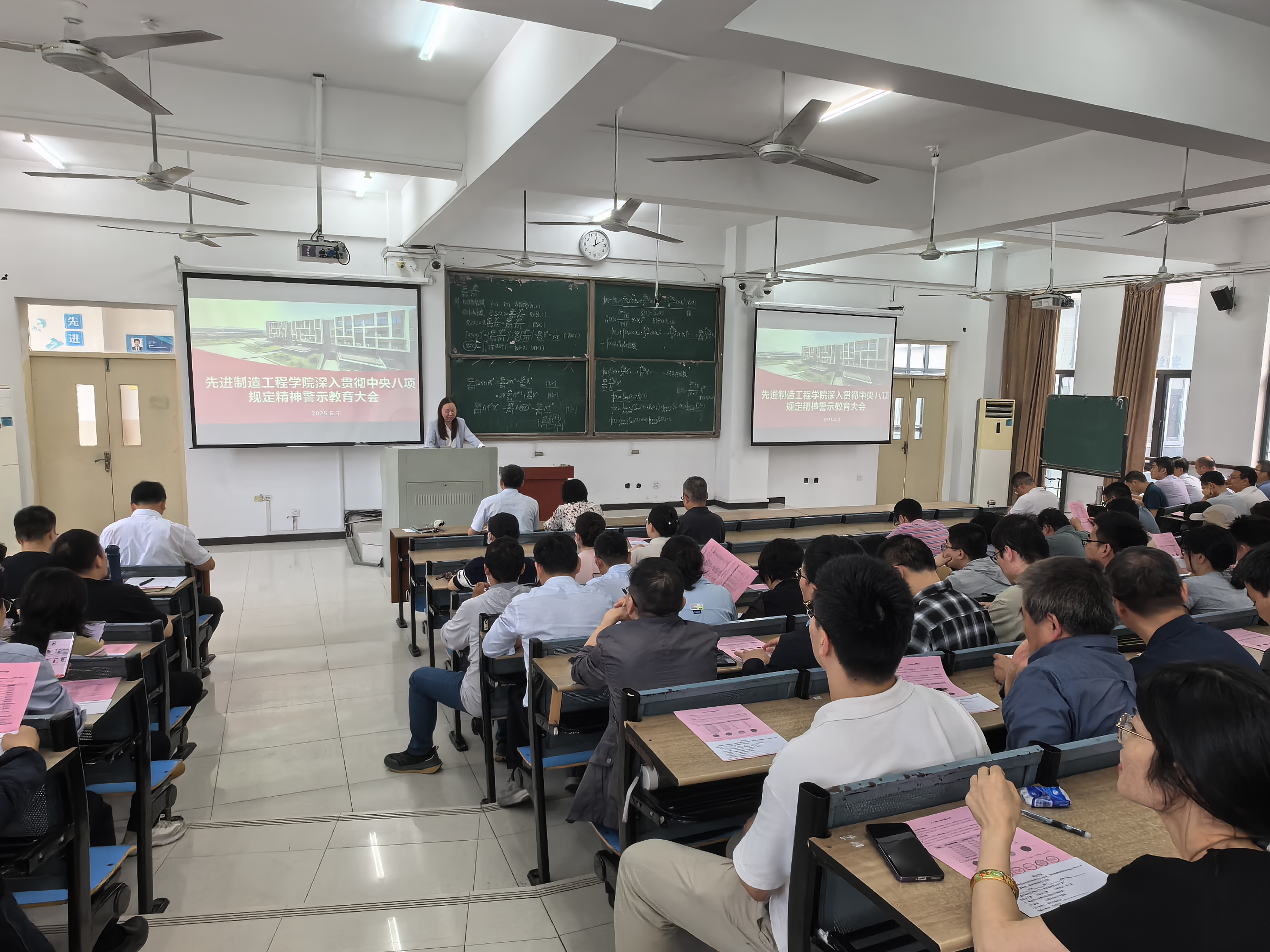 2025年6月3日下午,先进制造工程学院在38-3JT教室召开深入贯彻中央八项规定精神学习教育大会。院党委书记杜娟主持并讲话,院党委副书记、院长胡学友,院党委副书记、纪委书记蔡灵美,院党委委员、副院长胡国华和秦强出席会议,全院科级干部、支部书记和教师参加会议。