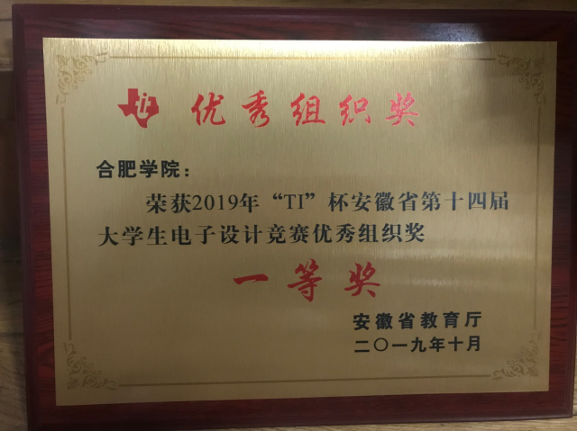 合肥学院荣获2019年“TI”杯安徽省第十四届大学生电子设计竞赛优秀组织奖一等奖,参赛学生荣获安徽省一等奖4项,二等奖1项,三等奖5项。(先进制造工程学院李翠花