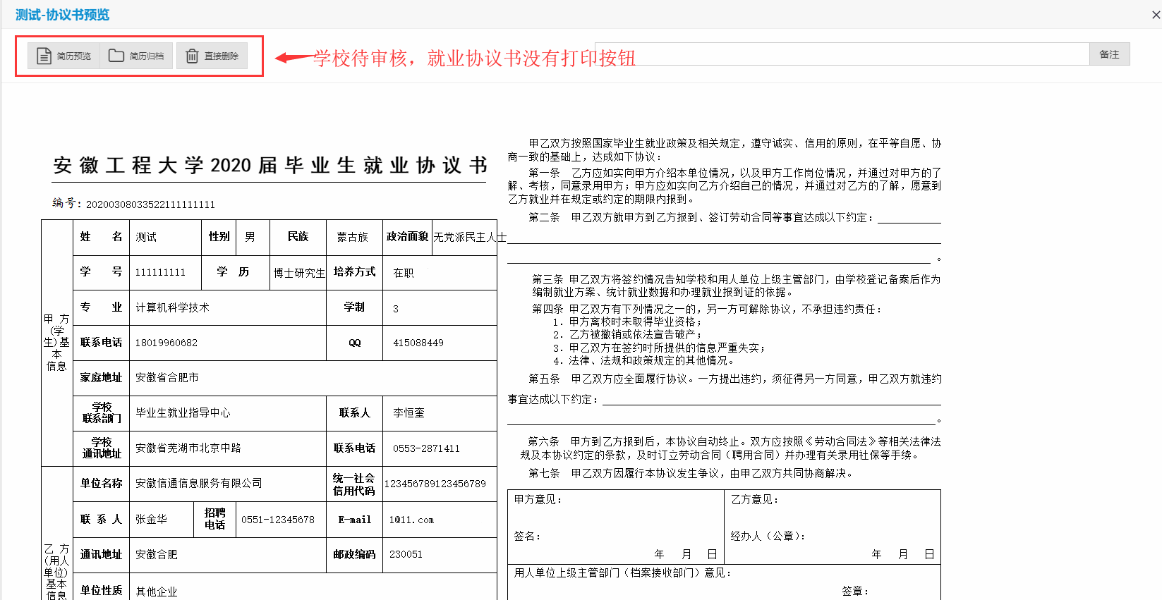 协议书默认打印3份(用人单位1份、毕业生1份、学校1份)。协议书打印完毕后,交给用人单位或毕业生,进行盖章签字后生效。(若毕业生在外地,可自行安装一个PDF打印机,打印成PDF文件,以便进行网上传输; 或打印出来后,扫描后传输)。