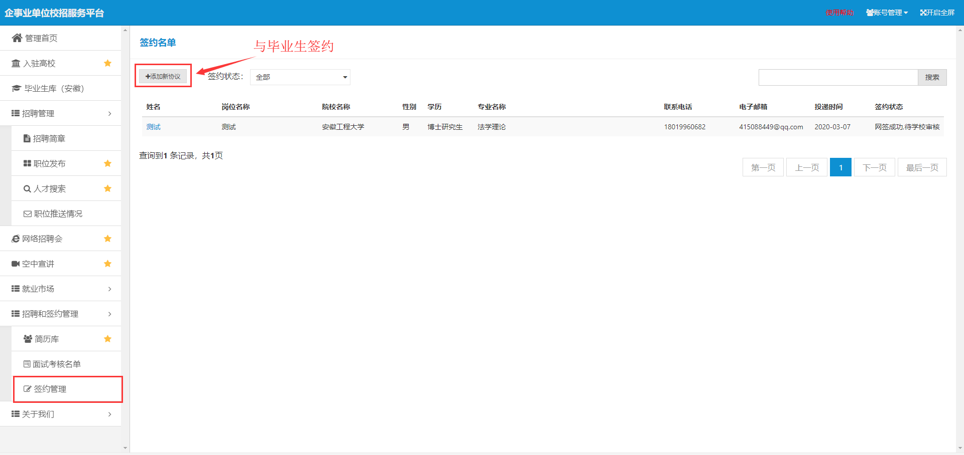 第四步、用人单位登录校招平台,处理面试结果并决定是否签约。