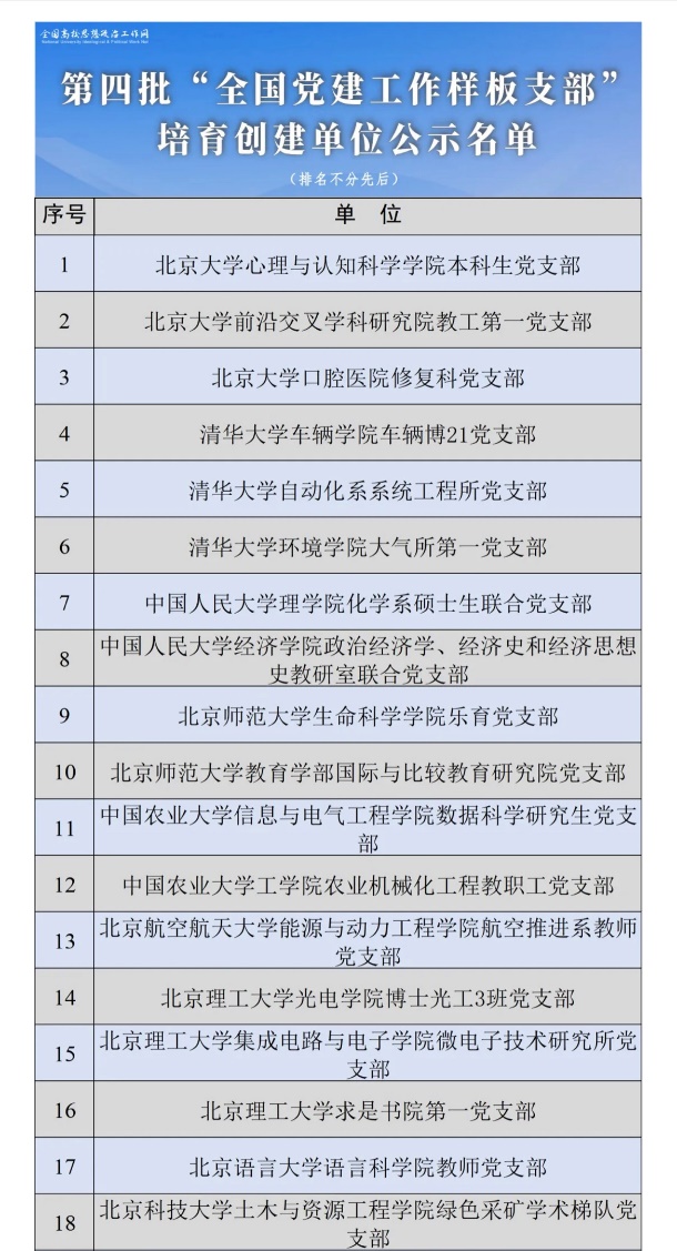 据悉,此次评选工作是根据《教育部办公厅关于开展第四批新时代高校党建示范创建和质量创优工作的通知》安排,经省级推荐、资格审查、专家评审、集中审议等多环节遴选后,最终产生了10个全国党建工作示范高校、100个全国党建工作标杆院系、1001个全国党建工作样板支部。