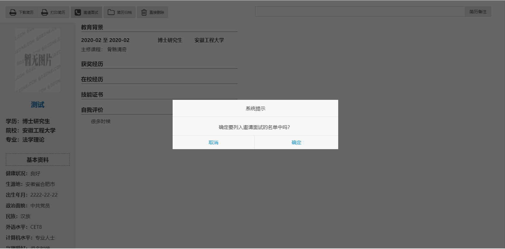 第二步、用人单位登录校招平台,查看简历,向意向毕业生发送面试邀请。