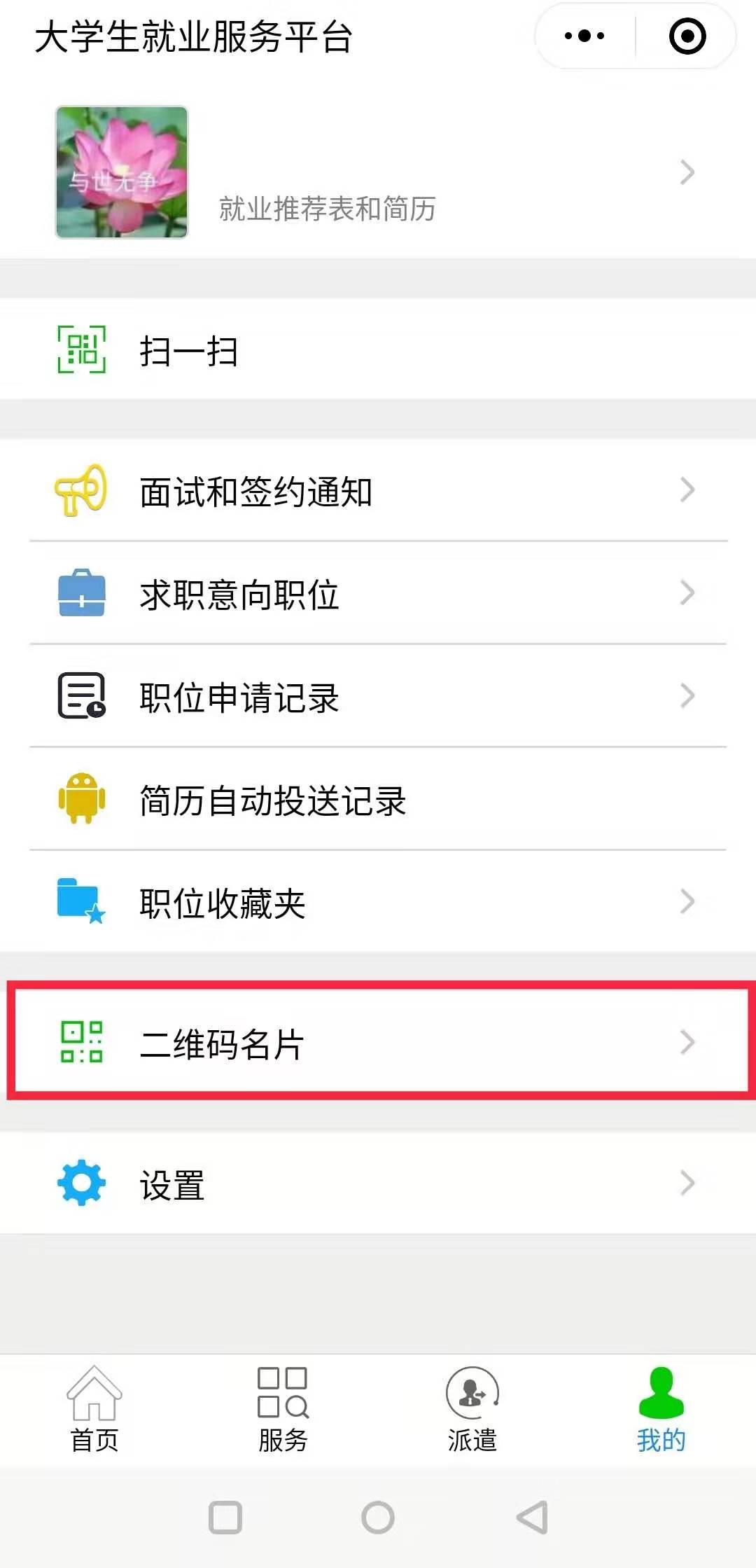 第一步、毕业生在“我的”中打开“二维码名片”,向用人单位招聘人员发送二维码,并告知使用微信扫描二维码。