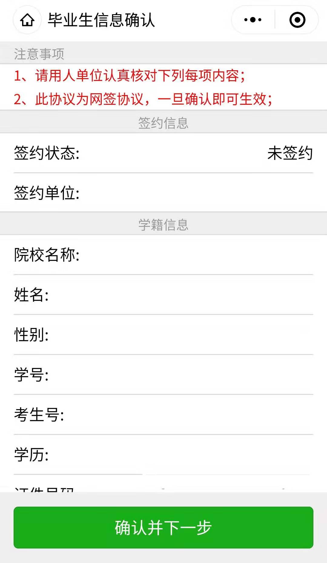 第二步、用人单位打开微信,使用扫一扫功能,扫码后,会出现填写签约信息页面;用人单位首先验证毕业生信息,确认下一步后,填写本单位基本信息和联系方式,并选择签约毕业生的工作岗位,然后点击“确认签约”后提交。