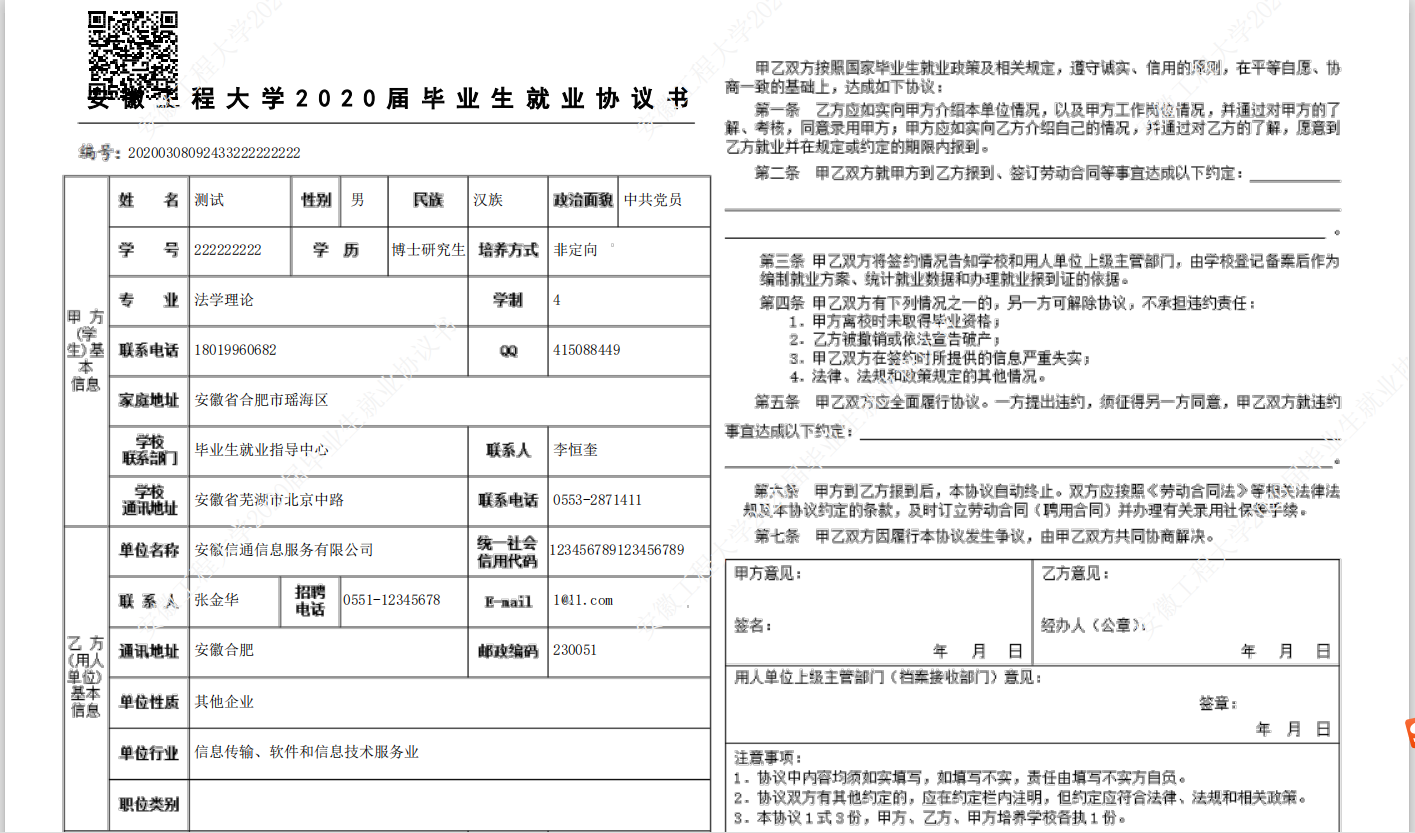 协议书默认打印3份(用人单位1份、毕业生1份、学校1份)。协议书打印完毕后,交给用人单位或毕业生,进行盖章签字后生效。(若毕业生在外地,可自行安装一个PDF打印机,打印成PDF文件,以便进行网上传输; 或打印出来后,扫描后传输)。