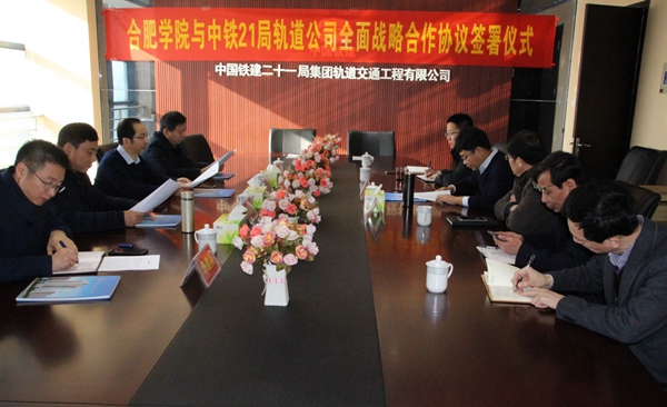 12月25日,合肥学院与中铁二十一局集团轨道交通工程有限公司全面战略合作框架仪式在轨道公司机关总部举行。我校党委委员、纪委书记洪家友与轨道交通工程有限公司总经理、党委副书记郑志民,分别代表双方签订战略合作协议。