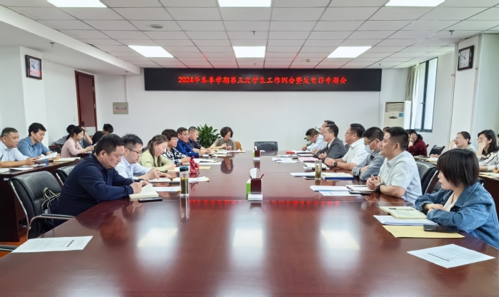 4月26日,2024年春季学期第三次学生工作例会暨反电诈专题会在行政楼八楼会议室举行。宣传部、保卫处、学生处、研究生处、校团委负责人,各学院党委书记、副书记、学工办负责人参会。会议由学生处处长丁增云主持。