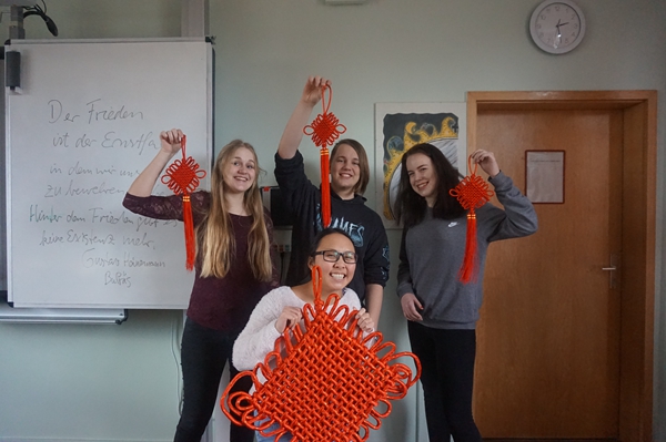 元月二十四日、二十九日和三十一日德国施特拉尔松孔子学院分别在其开设中文课程的施特拉尔松德汉萨文理中学,格赖夫斯瓦尔德蒙特苏里文理中学以及洪堡文理中学举办了丰富多彩的迎新年、庆春节文化体验活动。为了使学生们对中国的春节有直观的感性认识,孔院老师带去了新书写的对联、大红的“福”字和中国结,并详细解释其各自的文化含义。学生们对这些富含文化元素的物品充满了兴趣,纷纷赞叹其独特与神奇。孔院老师们“趁热打铁”,教同学们尝试写毛笔字,在古老的汉字艺术中体味传统文化的韵味。最后大家一边品尝着孔院老师带来的中国糖果,一边观赏传统动画片《大闹天宫》,在欢乐的氛围中结束了新鲜有趣的、喜迎春节的文化之旅。