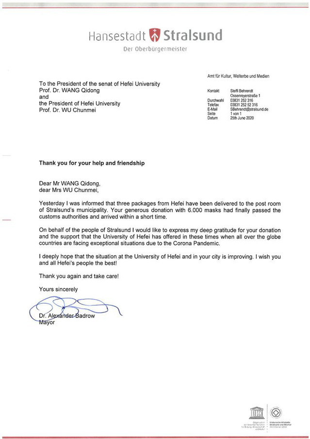 On behalf of the municipal government, Alexander Badrow, Mayor of Stralsund, expresses his heartfelt thanks in his letter to Dr. Wang Qidong, Chair of HFU Council and Dr. Wu Chunmei, HFU President, for HFU’s donation of 6000 medical masks.