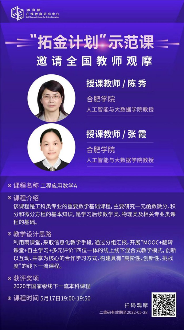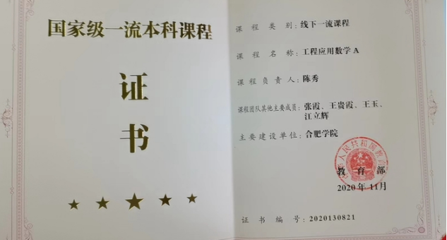 Launched in 2021 by the Online Education Research Center of Chinas Ministry of Education, the “Project Gold” is a nationwide plan to develop more excellent courses and lectures. Upon strict evalsuation, Applied Engineering Mathematics A, together with the other 96 courses, was selected from over ten thousand state-level or provincial-level excellent undergraduate courses, into the first batch of the project, which is a great fruit of the HFU math teaching team for their 15-year reform.