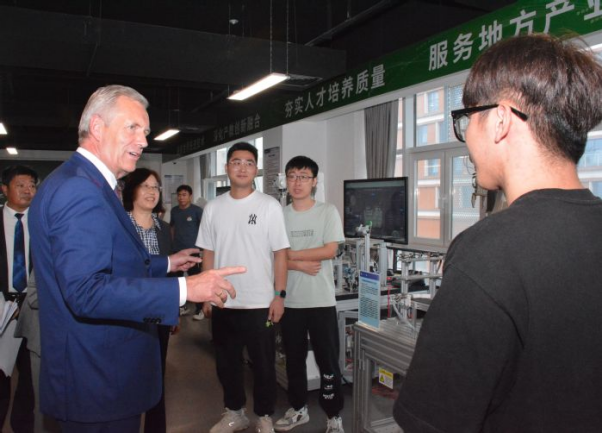 Afterwards, Mr. Wulff visited the school-enterprise training platform of Volkswagen College and highly affirmed HFUs school-running orientation locality, application and internationalization.