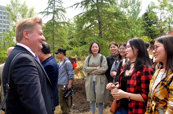 会后,格龙德与我校德语专业师生进行了热切交谈。宾主一行在我校二期校区共同种下了象征两国友谊的常青树,并在树前合影留念。