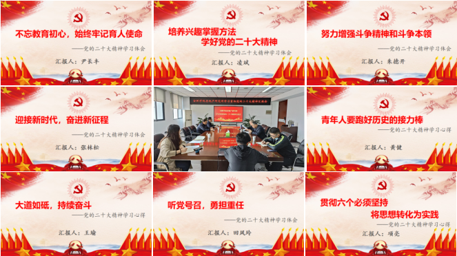 接下来,各位老师依次作汇报,汇报主题分别为“迎接新时代,奋进新征程”、“青年人要跑好历史的接力棒”、“大道如砥,持续奋斗”、“听党号召,勇担重任”、“贯彻六个必须坚持,将思想转化为实践”。