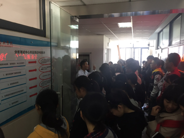 2017年10月31日下午12:50,我校生物与环境工程系2017级新生到合肥学院分析测试中心参观学习,共250余新生秩序井然、分阶段进入分析测试中心实验室。