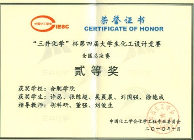 2010年获得奖项竞赛项目 | 级别 | 奖项 | 数量 | 参赛学生 | 指导教师 | “仲远杯”第四届大学生化工设计创业大赛 | 全国 | 铜奖 | 1 | 张陈超、冯杰、刘国强、张书娴、季会会。 | 胡科研等 | 铜奖 | 1 | 吴晨晨、郑伟、许忍、高娟、沈丹枫、徐德成。 | “三井化学杯” 第五届大学生 化工设计竞赛 | 赛区 | 一等 | 1 | 许忍、张陈超、吴晨晨、刘国强、徐德成。 | 全国 | 二等 | 1 |