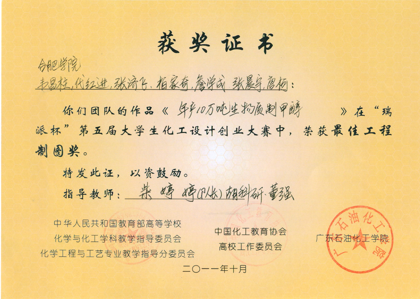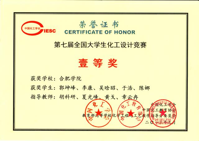 2011年获得奖项竞赛项目 | 级别 | 奖项 | 数量 | 参赛学生 | 指导教师 | “瑞派杯” 第五届大学生 化工设计创业大赛 | 全国 | 银奖 | 1 | 柴婷婷、韦昌柱、代红进、张济飞、柏家奇、詹学成、张晨宇、唐柯。 | 胡科研等 | 最佳工程制图奖 | 1 | 银奖 | 1 | 舒秀芬、吴升友、蔡金斌、陈佳骏、时应理、刘娇龙。 | “三井化学杯” 第五届大学生 化工设计竞赛 | 赛区 | 一等 | 1 | 舒秀芬、刘娇龙 唐柯、张济飞、韦昌柱。 | 全国 | 三等 | 1 | 赛区 | 一等 | 1 | 时应理、徐德成 柴婷婷、代红进、詹学成。 | 全国 | 三等 | 1 | 赛区 | 二等 | 1 | 吴升友、陈佳骏 蔡金斌、柏家奇、张晨宇。 | 全国 | 优秀 | 1 |