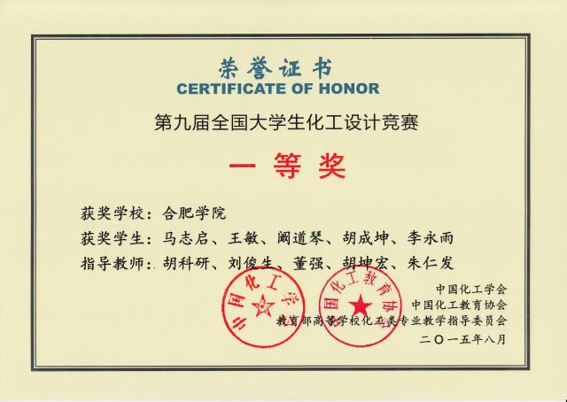 2015年获得奖项竞赛项目 | 级别 | 奖项 | 数量 | 参赛学生 | 指导教师 | “东华科技-三井化学杯”第九届全国大学生化工设计竞赛 | 全国 | 一等 | 1 | 马志启、胡成坤、阚道琴、王敏、李永雨。 | 胡科研等 | 全国 | 二等 | 1 | 夏双武、王顺、李亮、王静春、周娜娜。 | 全国 | 三等 | 1 | 李玉奇、李伟静、韩龙、付磊、陈凤莲。 | 全国 | 三等 | 1 | 程玲、解明勇、韩小敏、刘倩、胡进。 |