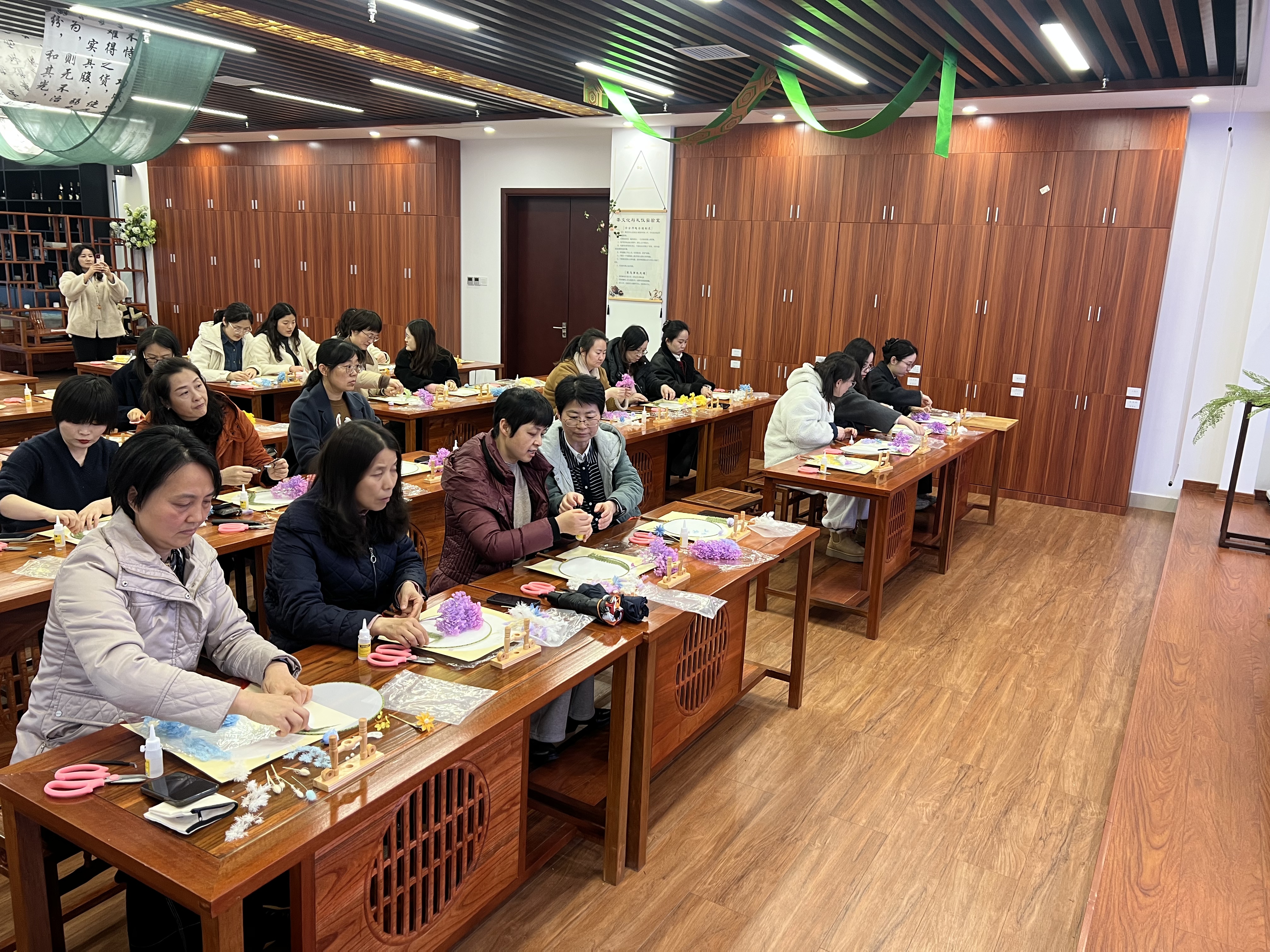 在制作环节中,女职工们充分展现出了自己的奇思妙想和独特创意。凭借着自己独特的审美眼光,大胆地组合不同种类的永生花,粘贴出充满艺术感的抽象造型,为团扇赋予了别样的韵味和风情,巧妙地搭配上小巧精致的饰品,为团扇增添了一抹个性与时尚的色彩,让原本朴素的团扇瞬间充满了独特的魅力。