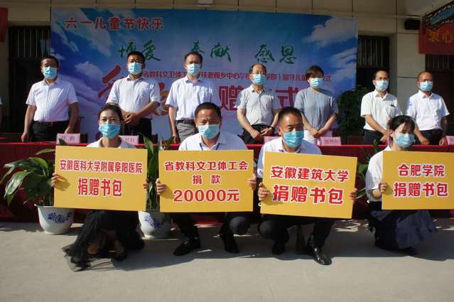 本次捐赠是安徽省教科文卫体工会联合合肥学院、安徽省建筑大学、安徽医科大学附属阜阳医院等单位对老观乡中心学校(小学部)留守儿童进行爱心捐赠。其中安徽省教科文卫体工会捐款2万元,合肥学院、安徽建筑大学、安徽医科大学附属阜阳医院为留守儿童共捐赠书包420支。