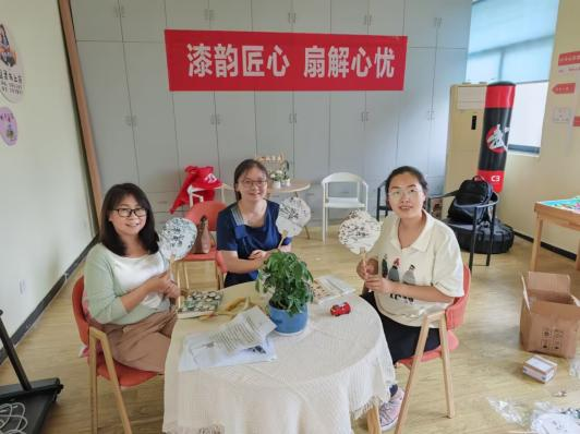 下午14:00 活动正式启幕,女教职工们齐聚活动场地,开启非遗漆扇创作之旅。制作过程中,女教职工们专注投入。调配漆料时,认真拿捏色彩比例,尝试打造专属色调;绘制图案时,或勾勒古典花鸟,或创作简约线条,将生活感悟与艺术灵感融入扇面。遇到难题,互相交流取经,现场氛围温馨又热烈。随着一把把漆扇逐渐成型,成就感在大家心中蔓延,压力也悄然消散。老师们面露笑容,和煦春风,面向镜头,喜悦点燃了她们的嘴角,手中的团扇与老师们的人格色调相得益彰,多姿多彩。