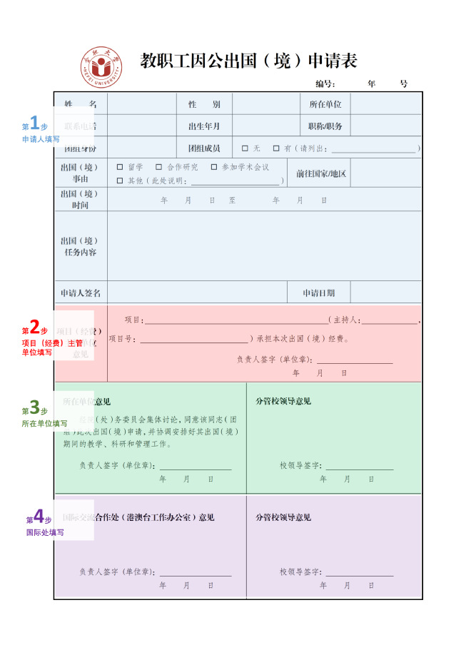 2. 申请人提交本次出国(境)事项至所在学院/部门研究,由所在单位负责人签署审批意见(单位主要负责人出访须报本单位分管校领导审批);