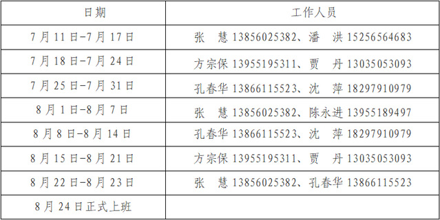 四、暑期实行轮休工作制,请大家根据工作分工和学校重点工作合理安排时间,对于异常情况及时上报,具体排班表如下: