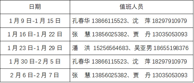 三、寒假期间安排值班,请各科室根据工作分工和学校重点工作合理安排时间 ,遇有突发事件,要按规定及时报告并妥善处置,确保学校安全稳定,具体排班表如下: