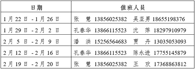 三、寒假期间安排值班,请各科室根据工作分工和学校重点工作合理安排时间,遇有突发事件,要按规定及时报告并妥善处置,确保学校安全稳定,具体排班表如下: